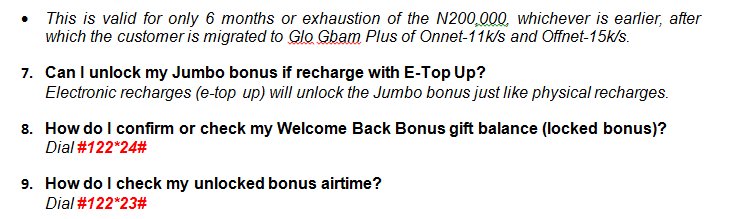 How To Unlock Glo Jumbo Bonus : If it was glo welcome back bonus you wish to check, simply dial #122*34 .. Charge rate on glo jumbo. And #122*35 to check unlocked bonuses. Dial *220*1# to view all your bonuses. Dial #122*24# to confirm or check your jumbo bonus balance (locked bonus), and #122*23# to check your unlocked bonus airtime. If it was glo welcome back bonus you wish to check, simply dial #122*34 .